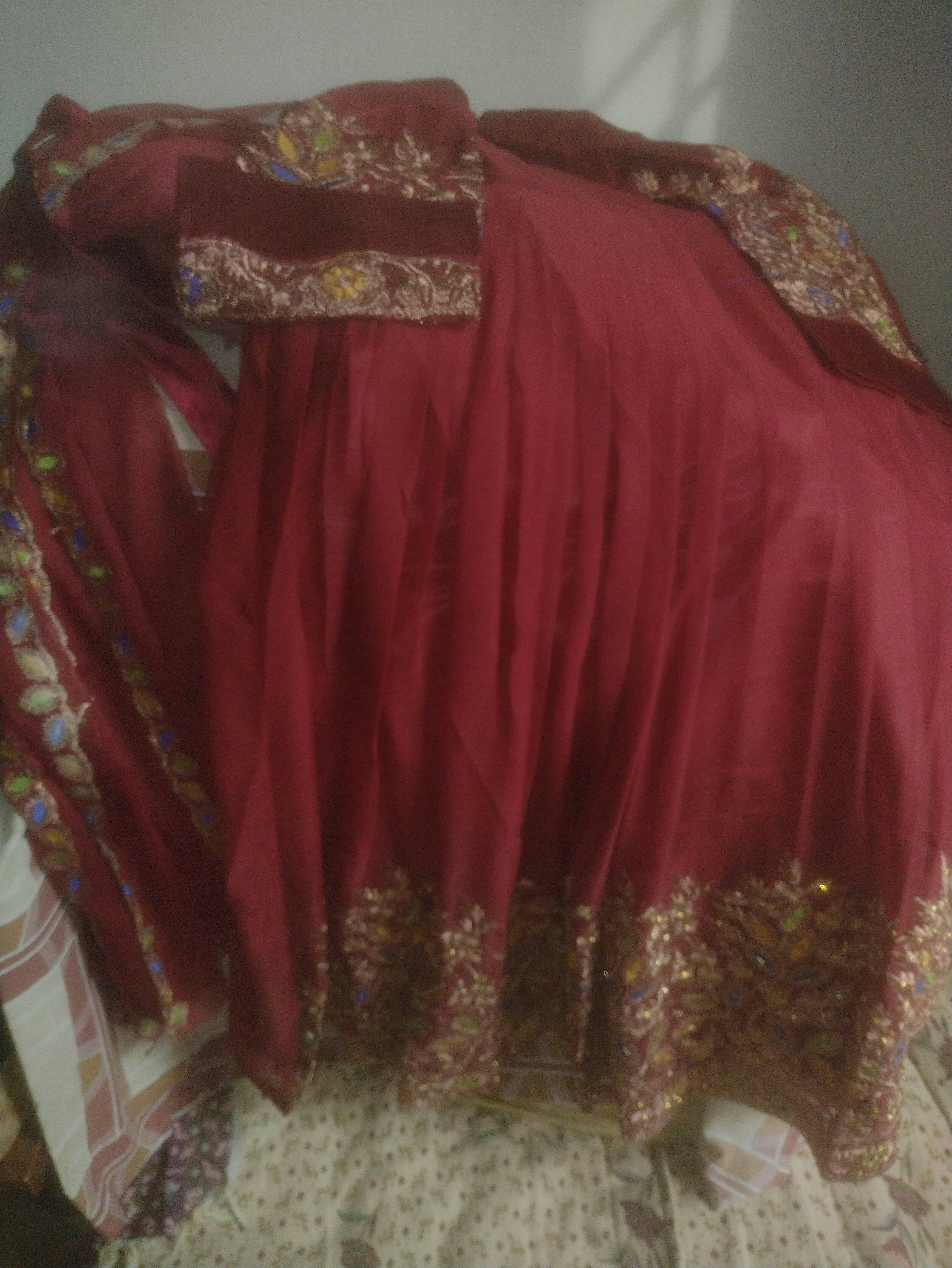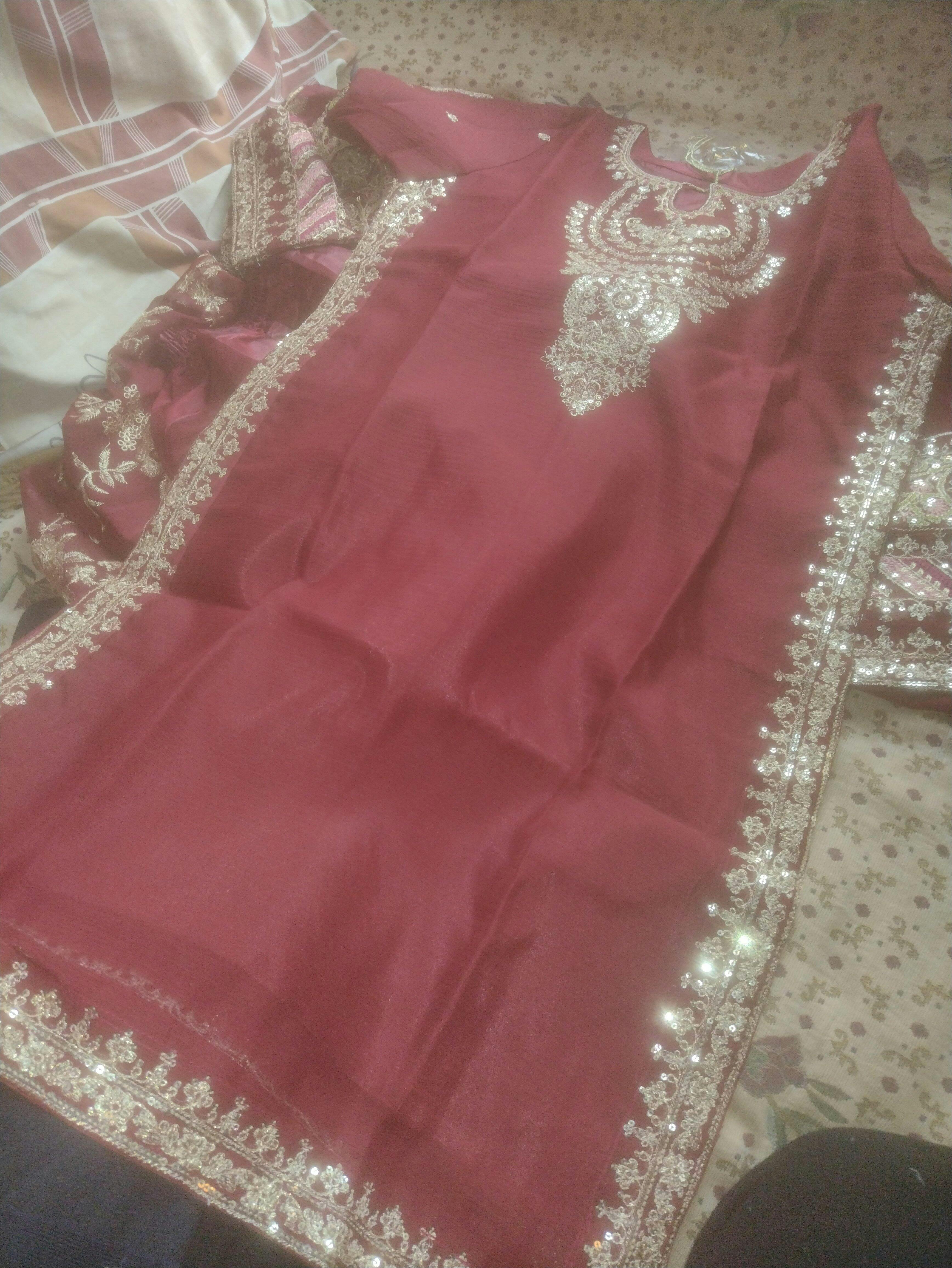 Massive flaired crinke chiffon chunnat styled frock with embroidered🧵gala daman & sleeves with embroidered dupatta & katan trouser 👗
